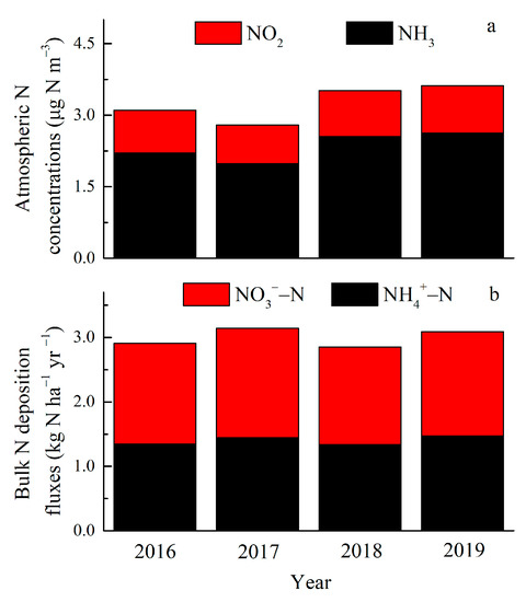Bulk Nr deposition was 2.91, 3.14, 2.85 and 3.09 kg N ha−1 y−1 in 2016, 2017, 2018 and 2019, respectively (Figure 5b). NH4+-N was the dominant species, its deposition being 1.56, 1.70, 1.51 and 1.62 kg N ha−1 y−1 in 2016, 2017, 2018 and 2019, respectively.