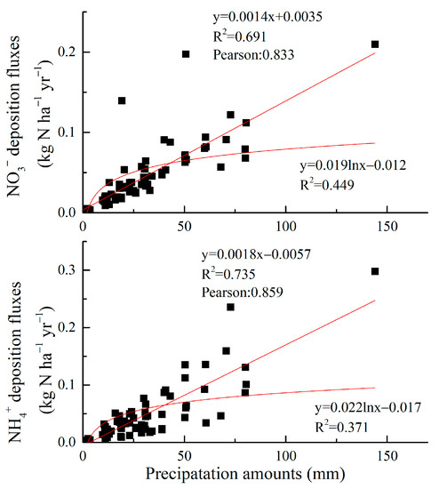 Bulk Nr deposition was determined from precipitation amount and Nr concentrations in precipitation [28]. We found that Nr deposition was mainly controlled by precipitation, increasing with precipitation. It has been reported that Nr deposition is logarithmically related to precipitation amount because atmospheric NH4+ and NO3− are scavenged by rainfall, and scavenging decreases as rainfall intensity, duration and amount increases [31]. At our site, the relationship between precipitation amount and Nr deposition fitted both linear and logarithmic equations. However, with a linear relationship for both NH4+ and NO3− giving the better fit (Figure 6a,b). This could be because atmospheric NH4+ and NO3− concentrations were both so low as to be almost unaffected by rainfall intensity, duration and amount. Although we could not measure gaseous/particulate NH4+ and NO3− concentrations because of limited technical resources, the low NH3 and NO2 concentrations support this idea to some extent (Figure 4a,b). Overall, precipitation amount was the dominant factor determining Nr deposition, both Nr deposition and precipitation showing similar patterns of monthly variation.
