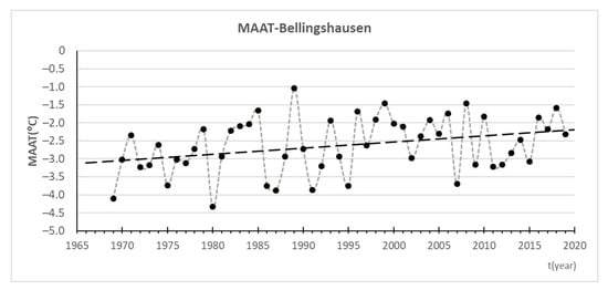 Mean annual air temperature in Bellingshausen station (King George Island) from 1968 to 2020. Data from SCAR Reference Antarctic Data for Environmental Research [].