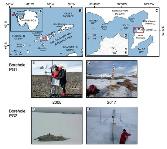 General setup of the permafrost boreholes. (A–D) Geographical setting of the boreholes in Antarctica, the South Shetlands and in Hurd Peninsula. (E) Borehole PG1 in the summer of 2008, (F) Borehole PG2 in the summer of 2008, (G) Borehole PG1 in the summer of 2017, (H) Borehole PG2 in the summer of 2017.