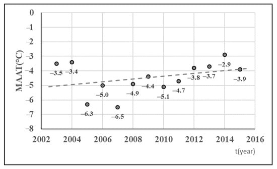 Mean annual air temperature at Mount Reina Sofia for 2003 to 2015 are shown in Figure 3, with a mean for the period of −4.5 °C, and with −4.2 °C for 2008 to 2015. From 2005 to 2011, MAAT were lower than or close to the mean, while after 2012, MAAT were close to those recorded prior to 2005. The lowest MAAT in the series was in 2007 (−6.5 °C) and the maximum in 2014 (−2.9 °C).