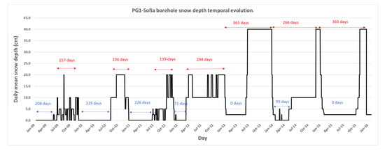 Snow cover at PG1 was characterized by an increment of duration along the period, with an increase in the daily snow depth that reached 40 cm in winter 2013 and spring 2014 to 2016 (Figure 4) and an important increase in the snow index (Table 3), from the autumn of 2012 to 2015, coinciding with the increase in MAAT (Figure 3). On the other hand, PG2 showed a steady annual increase in snow thickness (Table 3), from a snow-free surface in the summer of 2008 when the borehole was drilled to a 3.5 m thick pack of permanent snow early in 2016. This increase in snow accumulation has also been recorded over the neighbour Hurd Glacier [,].