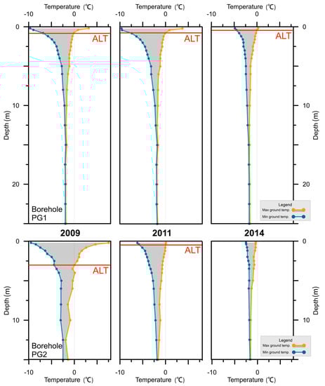 Maximum and minimum ground temperature and active layer thickness in PG1 and PG2 in three selected years (2009, 2011, and 2014).