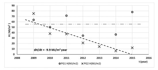 Table 6 shows the results of the application of Equation (7) for PG1 and PG2, expressed in total energy exchange (H) (MJ/m2) in the annual periods. The soil surface energy exchange shows no trend from 2009 to 2015 in PG1 with values varying from 35 to 78 MJ/m2. On the other hand, PG2 shows a continuous decreasing of H, with a trend of approximately −10 MJ/m2 per year, with values varying from 75 to 6 MJ/m2 from 2009 to 2015 (Figure 6).