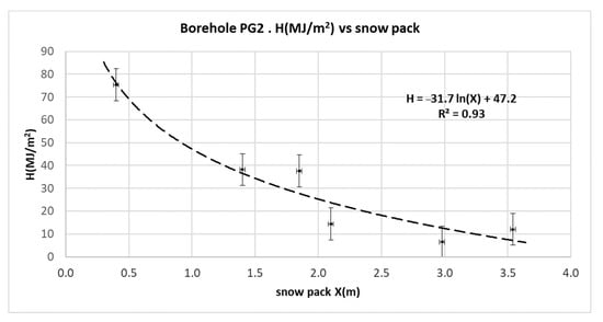 The behaviour of PG2 reflects a transition from a periglacial to a temperate glacial thermal regime, in which the active layer and freeze–thaw cycles typical of the periglacial domain completely disappeared []. The result was a ground thermal profile characterized by the reduction in the annual thermal amplitude at all depths, leading to a reduction in the total annual energy exchange (H), a decrease in the depth of the ZAA that approaches the interface ground-snow, and a complete disappearance of the active layer. Additionally, given the logarithmic fit between the dependence of the H versus the snow pack, which is presented in the Figure 7, the complete thermal isolation generated by the snow, H = 0 condition, correspond to a snow thickness of x~4.4 m.