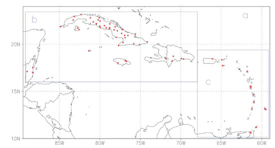 We use monthly precipitation data from 60 rain-gauges spatially distributed across the study area (Figure 1 and Table A1). Data from Belize and Cuba were supplied by the respective Meteorological Services from each country, while data from the Dominican Republic are homogenized series from [36]. Station data for the rest of the study domain were those used by [34].
