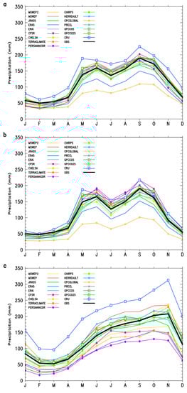 The mean precipitation annual cycle from the GPP (Figure 2a–c) reveals a high correspondence with observations for the subregions defined in Figure 1. For the western sub-region and the Caribbean as a whole, the GPP represent well the bimodal pattern of the rainfall, including the MSD (Figure 2a,b). There is strong coincidence between the GPP that overestimate or underestimate observations in the western Caribbean and the Caribbean as a whole. This may reflect the fact that the larger proportion of stations fall in the western Caribbean (45 out of the 60 stations). In the Eastern Caribbean (Figure 2c), where the MSD is absent and the land masses are smaller, the GPP similarly capture the main features of the observed annual variation pattern including the occurrence of the maximum in November. However, differences from the observations tend to be greater than for the western Caribbean and some GPP a such as PERSIANNCDR, CFSR, and CHELSA are even displaying a displaying the opposite sign in total precipitation particularly in the wet season months (not show). The implication is that a GPP that does well at capturing mean climate in the western Caribbean or the Caribbean as a whole may not necessarily be equally good in the eastern Caribbean.