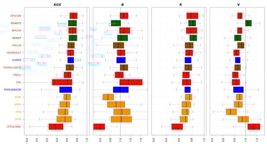 Boxplot of the KGE index and its components B (bias), R (correlation) and V (variability). The names of the GPP are colored according to data source considered in its development (red: stations; brown: stations and reanalysis; blue: stations and satellites; orange: reanalysis and green: multisources). The GPP have been sorted according to the median value of KGE index. In all the cases the optimal value is 1.0.