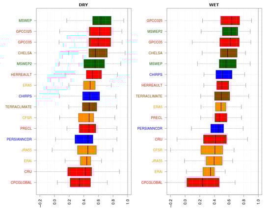 Figure 3 also shows the annual KGE component scores for each GPP. Relative performance with respect to correlation generally matches that for the overall KGE score suggesting the strong influence of the latter in the calculation of the former. It is noted that the five best GPP and the worst GPP with respect to median KGE also emerge as the GPP with highest correlation values (ranging from 0.752 to 0.841) and lowest value (0.582) respectively. A similar result was found by [24] when evaluating various daily precipitation datasets over the conterminous US. As in [24], we confirm that correlation has a dominant influence on KGE scores. For GPP to have a better representation of observations, then, improving this statistic, without degrading the information content, should be a priority. When the analysis is done by season (not shown), the median values of temporal correlations are comparable, ranging from 0.5 to 0.8 (0.45 to 0.75) for the dry (wet) season. Almost all GPP underestimate the rainfall variability in the region (median values from 0.7 to 0.95), except for CPCGLOBAL and MSWEP2, which are the only products that overestimate it. Across individual seasons MSWEP2 also shows the best results for variability (not shown).