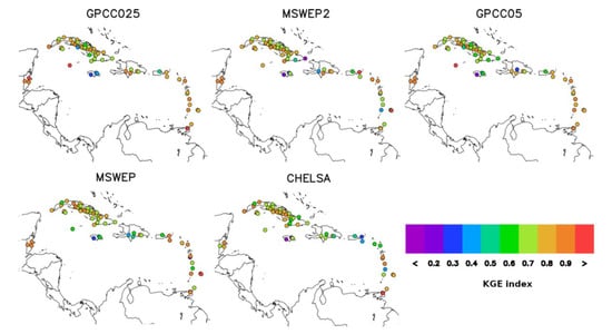 - The lowest KGE scores, suggesting a relatively poor performance, correspond to most reanalyses (except for ERA5) and consistently CPCGLOBAL. The reanalysis products are among the GPP with the lowest performance, which reflects the limitations of the current atmospheric models to represent the fine-scale precipitation processes. This might be due to limitations in representing sub-grid convection and land-surface parameterization schemes. This result also reveals a constraint related to the spatial resolution needed to adequately represent the small islands of the Lesser Antilles. A possible solution to this limitation could be the incorporation of high-resolution, non-hydrostatic, regional models [52].