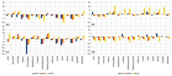 The results for selected drought statistics determined using SPI-0.5 and SPI-1.5 are presented in Figure 7 for SPI 3, 6, and 12. Overall, most of the GPP fail in representing accurately the SPI-0.5 statistics (Figure 7a,c), having different ratings for different statistics. The GPP with best performance were MSWEP, MSWEP2, ERA5, and CHELSA. For SPI-1.5 (Figure 7b,d), the GPP better resemble the observations with a discernible distinction between the worst and best performers, and a tendency to overestimate the maximum consecutive months with drought and the number of drought events. In general, products such as MSWEP2, ERA5, CHELSA, and MSWEP were the most accurate. The best performing products across both SPI statistics are the same as those with highest correlations in the KGE analysis (see Figure 3). We note, however, that care must be exercised when assessing GPP performance on the basis of an individual drought statistic, as it only offers a limited perspective while not capturing the overall ability of the GPP across SPI’s of different intensity and length. For instance, following the methodology used by [23], who only consider DF in the evaluation of GPP, we would conclude that CRU or TERRACLIMATE are among the best GPP for SPI-0.5. Conversely, if we take into account the DE statistics, the performance of those GPP is not as good. Similarly, we find that PRECL is among the GPP with best skill in representing DE statistics for SPI-0.5, but not DF for SPI-0.5.
