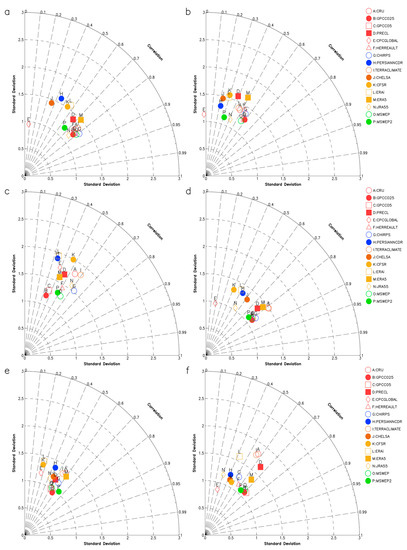 Taylor diagrams for the areas with SPI lower than −0.5 (a), moderate and severe droughts (b,c, respectively). SPI greater than 0.5 as well as moderate and severe wet conditions are shown in (d–f), respectively.