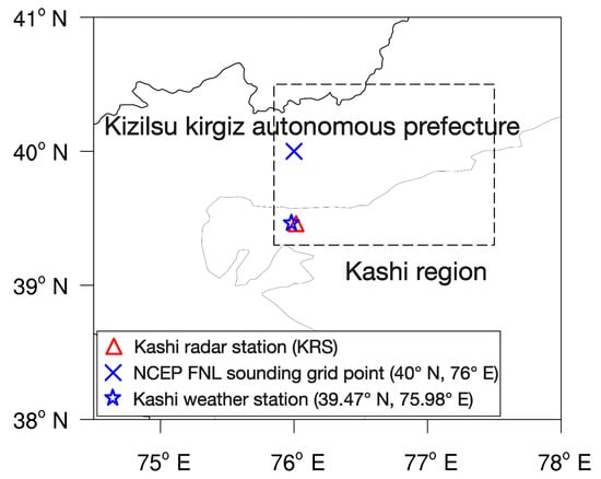 The CI is often defined as the first occurrence of radar reflectivity over 35 dBZ within a convective cell (e.g., [3,30,31,38,39]). The evolution of the CI features and the associated severe convective system were observed by the Kashi Doppler weather radar. (All the observation data were provided by the National Meteorological Center of the China Meteorological Administration (CMA)). At 1004 UTC (Figure 4a), a convective cell initiated about 50 km to the northeast of the Kashi radar station (KRS). Several other convective cells appeared nearby at 1016 UTC (Figure 4b), they extend to a height of about 2.5–8 km AGL (figure not shown). In the following ~1 h (Figure 4c–g), there were more than 10 convective cells, and some of them merged together and developed significantly in both size and intensity. By 1130 UTC (Figure 4h), a relatively intense MCS developed with an orientation in the northwest–southeast direction.