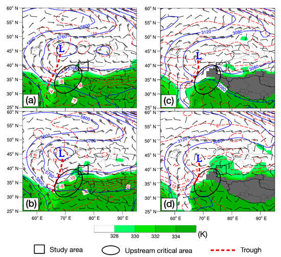 In order to investigate the environmental conditions of this severe convective weather, the six-hourly National Centers for Environmental Prediction (NCEP) Final (FNL) analysis dataset with a resolution of 1° × 1° was analyzed. As shown in Figure 2a, a moderately intense cold low (indicated by bold blue letter “L”) was located over the area between Aral Sea and Balkhash Lake at 500 hPa at 0000 UTC on 23 June 2015. It showed a “cut-off low” feature with a closed isoheight and two closed isotherms; however, the cold center was not collocated with the low center. A trough showing a distribution along the north–south direction can be identified according to the wind field. The severe convective weather occurred in the study area ahead of the trough. Westerlies dominated in an area to the south–west of the study area which is believed to be critical for the moisture advection (labelled as “upstream critical area” in Figure 2).