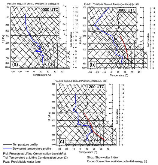 Since the sounding observations in China are twice daily at 0000 UTC and 1200 UTC, a representative sounding derived from the NCEP FNL analysis data was analyzed at 0600 UTC in order to examine the environmental conditions more close to the occurrence of the severe storm (Figure 3b). This exhibited a relatively high CAPE of 1981 J·kg−1, with a similar dry condition near the surface, showing a dewpoint depression of ~14 K. The humidity increased with height and reached a dewpoint depression of ~3 K at about 670 hPa, while the humidity at about 600 hPa showed a relatively dry condition with a dewpoint depression of ~12 K. However, the level from 500 to 300 hPa was rather moist (the dewpoint depression decreased to 2–4 K) and was dominated by the westerlies and southwesterlies in the layer from 450 to 300 hPa. By 1200 UTC (Figure 3c), the CAPE decreased significantly to 653 J·kg−1, with the surface becoming rather dry (the dewpoint depression reached ~25 K). However, the level between ~600 and 500 hPa showed an almost saturated condition (i.e., the dewpoint depression decreased to ~1 K), while the upper level above 500 hPa became relatively dry. Furthermore, there was a warm advection indicated by the veering of the horizontal wind with height (from southerlies to west–southwesterlies) in the layer from 700 to 500 hPa.