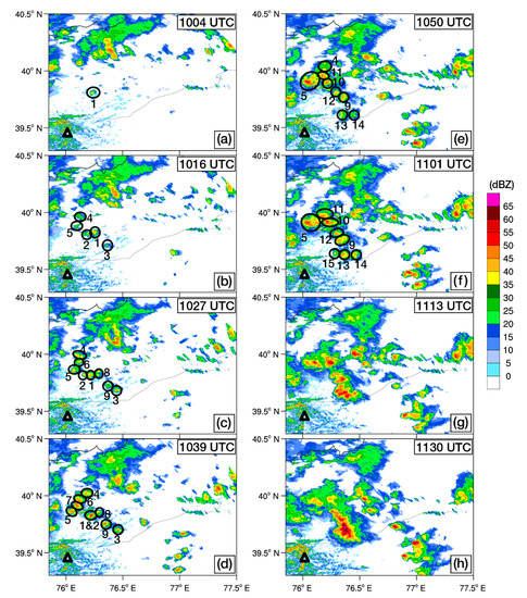 (a–h) Observed composite reflectivity (shading; unit: dBZ) observed at KRS (indicated by black triangle) at different times from 1004 UTC to 1130 UTC on 23 June 2015. The convective cells are numbered in time order and indicated by black circles. The specific time is shown in the upper right corner of each panel.