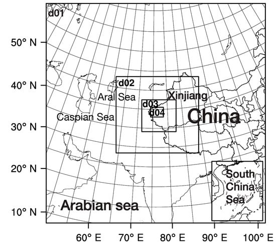 Geographic locations of the WRF model domains. The innermost domain (d04) covers the whole study area, as shown in Figure 1.