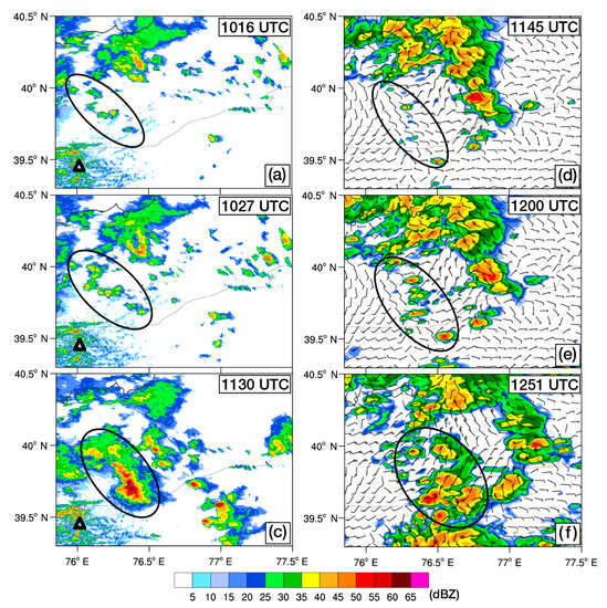 The model results showed that several CIs (indicated by ellipse) occurred continuously in an area about 40–50 km northeast of the KRS, although they developed about 1.5 h later than their observational counterparts and were displaced by ~10 km to the southeast (Figure 6d). Over time, several other CIs occurred continuously nearby (Figure 6e), showing a distribution along the northwest–southeast direction, which were in agreement with the observations. More than half of these convective cells underwent rapid development in both size and intensity and eventually formed a loosely organized MCS (indicated by ellipse in Figure 6f), but with lower estimated intensity (less than ~60 dBZ).