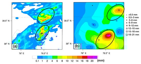 Figure 7 compares the observations of simulated 8-h accumulated precipitation. Due to the relatively sparse population, lagged economic development and harsh environment such as desert and gobi, there are only several conventional meteorological stations and 11 surface automatic stations which have valid precipitation records in the plotted area. The accumulated precipitation also showed some biases in time (~1 h), location and distribution pattern due to the biases of time, location and the intensity of the simulated MCS. However, two areas of high accumulated precipitation (indicated by black ellipses) can be identified in the simulation, consistent with the observations. (The Cressman interpolation was used in the observation, as it performs the best among the four methods (i.e., Cressman, natural neighbor, inverse distance weighted and tension splines) tried in this case.)