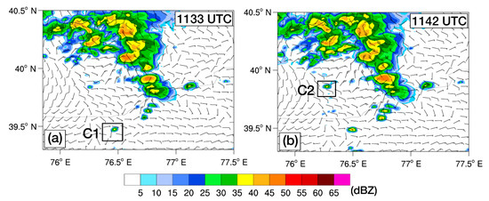 (a) Simulated composite reflectivity (shading; unit: dBZ) and ground relative wind field (full and half barbs represent 4 and 2 m·s−1, respectively) at the height of 10 m above the ground level on 23 June 2015 for C1. (b) is the same as (a) but for the C2. The black boxes in both panels denote the area where the two convective cells occurred for the first time. The specific time is shown in the upper right corner of each panel.