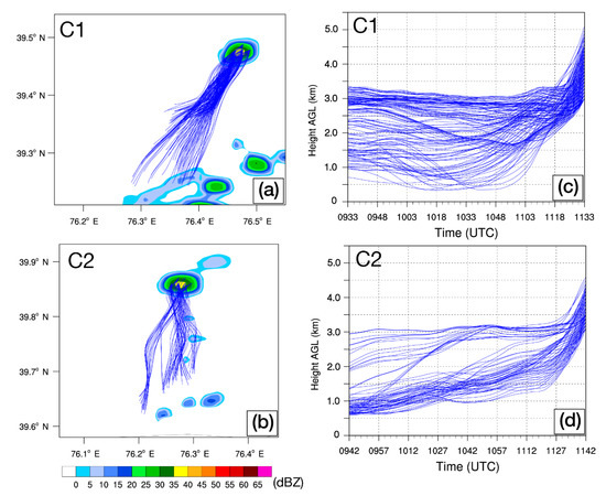 (a,b) Simulated composite reflectivity (shading; unit: dBZ) and ground-relative backward trajectories (blue lines, projected to the ground) of air parcels for 2 h within the two convective cells released at the CI time of 1133 and 1142 UTC, respectively, on 23 June 2015. (c,d) Height along the backward trajectories of air parcels within the two convective cells.