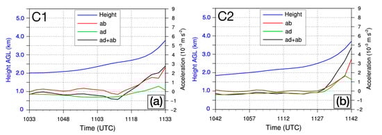 In order to explore the CI mechanism, Lagrangian vertical momentum budgets were analyzed along the backward trajectories of air parcels within the two cells. According to Jeevanjee and Romps [48], the vertical acceleration can be decomposed into two parts, namely, buoyant acceleration () and dynamic acceleration ()—i.e.,