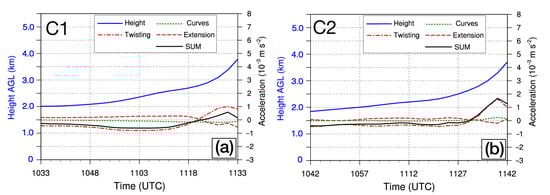 (a) Average height and three components (Curves, Twisting and Extension) of the dynamic acceleration () and sum of them (SUM) along all air parcels selected within the C1. (b) is the same as (a) but for the C2.