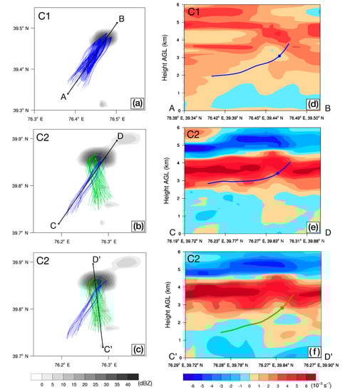 In order to obtain an intuitional understanding of the vertical twisting, the vertical cross section of the vertical shear of the horizontal wind along a line segment which almost runs parallel through the central region of the ground-relative backward trajectories of air parcels are analyzed (Figure 12). The vertical cross sections of vertical shear of the horizontal wind and averaged height of the backward trajectories and parcels at 6 min prior to the CI along the three line segment (i.e., AB, CD and C’D’) showed that (Figure 12d–f), as the air parcels lifted significantly between ~2.5–4 km AGL, they entered an area with high vertical shear of the horizontal wind. Consequently, it indicates that the air parcels encountered an environment with high vertical shear of the horizontal wind where the air parcels exhibited relatively large vertical twisting (analyzed above) due to the vertical wind shear prior to the CI. (The vertical shear of the horizontal wind was strengthened in a period about 1.5 h before the CI (figure not shown).)