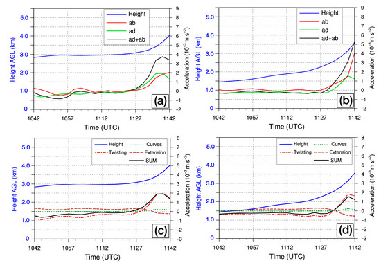 The vertical momentum components (i.e., and ) along the two portions of air parcels from different directions within the C2 will be analyzed to verify the robustness of the conclusions (about the source of CI) drawn above. For the air parcels from southwest within the C2 (Figure 13a), the averaged along the air parcels was slightly greater than most of the time during the early ~45 min, and increased significantly during the last ~15 min. The also increased significantly and become slightly greater than during the last ~15 min. For the air parcels from south (Figure 13b), the averaged was greater than almost during the whole 1-h period, and showed a significant increasing trend in the last ~15 min. The also clearly increased during the last ~15 min, and showed almost the same value with at ~3 min prior to CI. The intensity of during the rapid lifting period (last ~12 min) for the air parcels from the southwest was greater than that of the air parcels from the south. This is probably due to that the height of the parcels from southwest was higher than that of the parcels from south, and was affected by higher vertical shear of horizontal wind, because the vertical shear of horizontal wind between 2.5–3.5 km was increased with height (see Figure 12e,f). Figure 13c,d show the evaluation of the averaged three components of along the air parcels from the southwest and south, respectively. It can be found that their overall features are almost the same, as shown in Figure 11a,b—i.e., was dominated by the vertical twisting term in the rapid lifting period.