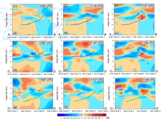 An important issue related to the mechanisms of CIs in this case that remains unclear is the reason for . In order to investigate the possible source of , the vertical cross section of potential temperature anomaly along the three line segments (i.e., AB, CD and C’D’) are analyzed in the following section (Figure 14). For C1, there was a positive potential temperature anomaly in the surrounding environment of the averaged height of the air parcels during the early slow lifting period (Figure 14a). Similarly, the environment near the average height of the air parcels exhibited a positive potential temperature anomaly for the air parcels from the south within C2 during the early slow lifting period (Figure 14g). Therefore, this implies that the warming in the level below ~2.5 km AGL was the reason of the which caused the slow lifting of the air parcels elevated from lower altitude for both C1 and C2 during the early ~45 min. During the last ~15 min for C1 (Figure 14b,c), the average height of the air parcels reached a level above ~2.7 km AGL, and its upper environment obviously warmed with time, showing a significant warm core several minutes prior to CI. A similar phenomenon can roughly be found near the average height of the air parcels within C2 (Figure 14f,i). Consequently, this implies that this kind of warming during the last ~15 min is the contributor to the for both convective cells.