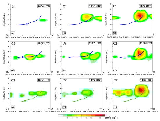 (a–i) The same as Figure 14a–i but for the vertical cross sections of hydrometeors (including cloud, graupel, rain, ice and snow) (shading, unit: 10−2 g·kg−1) on 23 June 2015. The specific time is shown in the upper right corner of each panel.