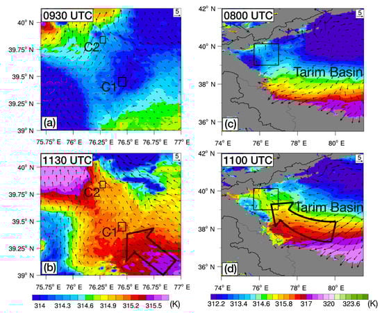 The reason for warming during the rapid lifting period during the last ~15 min prior to the CI was analyzed above. However, one more issue about the reason for warming in the low level (below 2.5 km AGL) is still unclear. In order to figure out the reason, the plane figures of potential temperature and wind field were analyzed. It was found that there was a significant warm advection from the southeast at 3000 m above sea level (ASL) during the time 1~2 h prior to the CI (Figure 16a,b) (The altitude of the area where the two convective cell occurred is ~1400 m ASL.) It can be seen from the bigger scope of the area that (Figure 16c,d), there was significant radiative heating from 0800 UTC (i.e., 1400 local time) to 1100 UTC (i.e., 1700 local time) near the mountainous area on the south side of the Tarim Basin. Besides, the southeasterlies strengthened with time and generated a significant warm advection from the southeast to the study area, thus causing warming in the low-level 1~2 h prior to the CI. (The potential temperature and wind field at 3500 m ASL showed almost the same feature (figure not shown)).