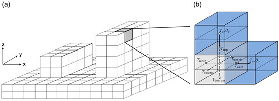 (a) Three-dimensional representation of urban buildings and ground surfaces in the microscale urban surface energy (MUSE) model. (b) Definition of the six patches (top, bottom, east, west, south, and north) and the active patches that interact with the surrounding atmospheric grid cells (blue). and are the air temperature and wind speed at the adjacent atmospheric grid cells, respectively.