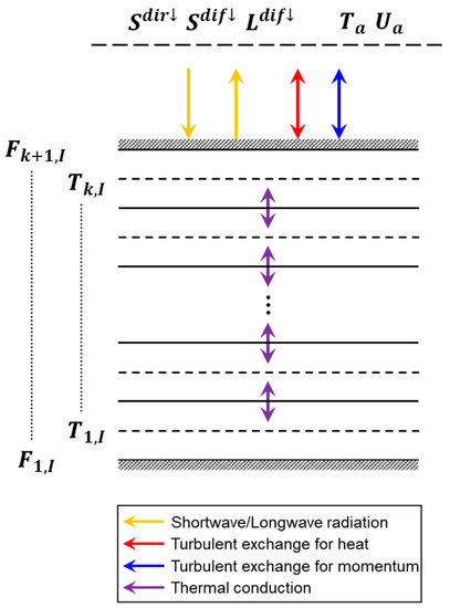 Every active patch consists of multiple subsurface layers to represent conductive heat transfers in buildings and grounds. This process is one of the essential physical processes in the formation of urban heat islands [68]. The MUSE model assumes that the conductive heat process occurs in a one-dimensional column (Figure 2). From the conservation of energy, the media temperature at each subsurface layer of the patch can be calculated with an explicit finite differencing by