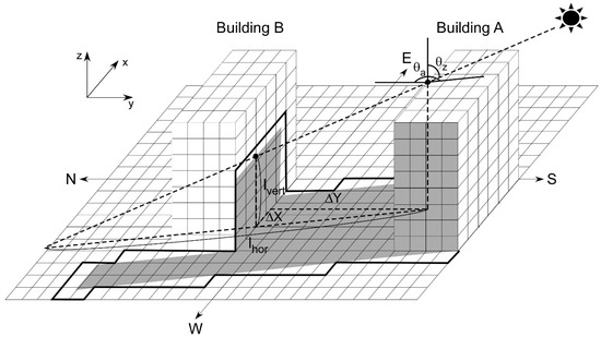 where () is the horizontal distance between the point and the patch . Here, the point location is defined by a relative distance separated from the patch with and . Therefore, the shaded patches by the patch of a building are determined as the patches that exist on the horizontal and vertical shadow paths. The MUSE model inspects every patch on the horizontal shadow path moving forward from the location of patch with a small distance step of (, ) = (, ). Here, is the solar azimuth angle and is the step size of length.