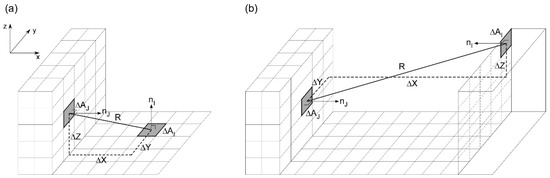 In this study, the analytically-based numerical method by Lee et al. [63] is used for perpendicular and parallel patches to calculate the patch–patch view factors and the patch–sky view factors (Figure 4). When the two patches and are perpendicular to each other with a distance of , the patch–patch view factor () can be computed as follows: