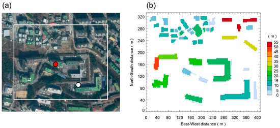 (a) The aerial view of the study area for the real urban environment test of the MUSE model (Source: Google Earth). The study area (36.4717° N, 127.1426° E) is located in the Kongju National University, South Korea, and a micrometeorological flux tower has been installed at the rooftop of a campus building (~33 m a.g.l.) (red circle). The surface temperatures were measured at the roof and wall surfaces of the building (red circle) and the road site (white circle). (b) The validation simulation domain and building height representation in the MUSE model. Each building height was represented using National Geographic Information System (NGIS) database from National Geographic Information Institute (NGII), Ministry of Land, Infrastructure and Transport (MLIT) of South Korea.