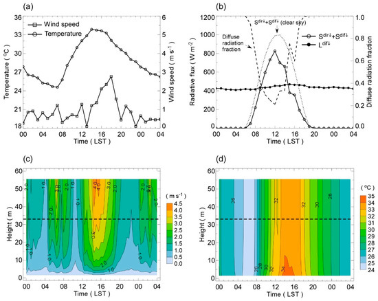 Diurnal variations of the (a) air temperature and wind speed and the (b) downward shortwave and longwave radiation measured from the flux tower at the Kongju National University campus on 19 August 2016. The measured global shortwave radiation is partitioned to the direct () and diffuse () shortwave radiation according to the diffuse radiation fraction (dashed line in (b)) calculated following Overby et al. [43] and Monteith and Unsworth [71]. Time-height sections of the meteorological profiles of the (c) wind speed and (d) air temperature calculated from the meteorological and flux measurements at 33 m a.g.l. and the Monin–Obukhov similarity relation. The horizontal dashed line indicates the measurement height.