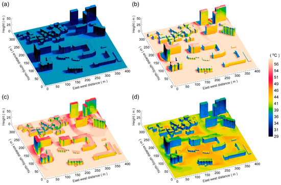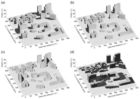 Three-dimensional distributions of sunlit/shaded patches over the real urban area calculated by the shadow model at (a) 09 LST, (b) 12 LST, (c) 15 LST, and (d) 18 LST on 19 August 2016.