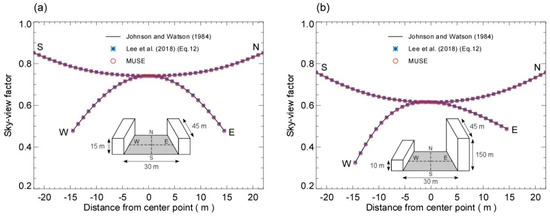 Comparison of the patch–sky view factor () at horizontal patches estimated by the MUSE model and the analytical method (Johnson and Watson [59]) for (a) symmetrical finite length street canyon and (b) nonsymmetrical finite length street canyon. The computation by Equation (12) in Lee et al. [63] is also compared.
