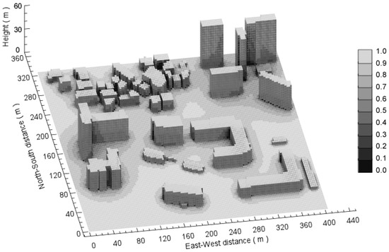 Figure 9 presents the spatial distribution of the patch–sky view factors computed for the real urban area. The patch–sky view factors at horizontal patches have values ranging from 0 to 1, whereas the patch–sky view factors at vertical wall patches have values ranging from 0 up to 0.5. It shows that the patch–sky view factors vary significantly over the domain by representing the complicated building morphology. The patch–sky view factor is low in dense building areas while it is relatively high on the roof patches and open ground areas. Tall buildings influence the surrounding low-rise buildings by reducing the sky view factors. As the MUSE model can calculate the patch view factors on an analytical level of accuracy for the idealized urban geometries (Table 4), the computation uncertainty for the real urban area is only associated with the representation accuracy of buildings’ geometries, showing the capability of the MUSE model in determining the patch view factors for real urban environments.