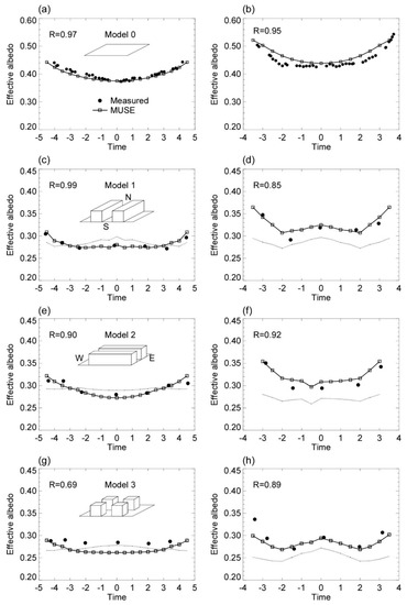 The effective albedo, which is defined by the ratio of outgoing shortwave radiation to incident shortwave radiation, is an appropriate parameter for validation of the shortwave radiative processes within urban canyons, including radiative trapping effects discussed in Section 2.2.3. The experimental study of Aida [76] is used for the validation, which has been applied in many previous studies (e.g., [40,67,77,78]). In the experimental study, ideal canyon structures (“model”) of the north-south canyon model (“model 1”) and the east-west canyon model (“model 2”), and the cubed array canyon model (“model 3”) were set up using cubed concrete blocks with height and width of 0.15 m. The effective albedo was measured at 0.45 m high using pyranometers. The MUSE model is applied for the experimental data obtained on a summer day (15 June 1978) and a winter day (3 December 1977) to the three different canyon geometries, which are configured with the same size of blocks as in Aida [76] experiments. The block surface albedos of wall and ground surfaces are assigned by 0.4 following Aida [76], but the rooftop and road surface albedos are assigned to vary diurnally according to an empirical correction relation of the albedo following Sievers and Zdunkowski [77]. It was found that the surface albedo varied with the altitude of the sun due to the angular dependency of surface reflectivity in the experiment for the flat surface model (“model 0”) (Figure 10a,b). However, the MUSE model can not capture the angular dependency because it assumes Lambertian isotropic surface reflection. Therefore, the empirical corrections of the flat surface albedos were applied for validation purposes. The downward shortwave radiation and its partitioning into the direct and diffuse shortwave radiation are calculated based on empirical formulas in Overby et al. [43] with clear-day atmospheric turbidity conditions in Monteith and Unsworth [71].