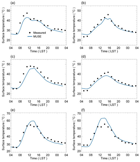 Field measurements conducted in a real urban environment are used to validate the performance of the MUSE model in simulating spatial heterogeneities of surface temperatures and surface energy balance fluxes. Field measurements were conducted at the Kongju National University campus in South Korea on a hot summer day of 19 August 2016 (Figure 5a). The study area consists of several buildings of apartments, campus buildings, and low residential houses. A micrometeorological tower has been installed at the rooftop of a campus building (36.4717° N, 127.1426° E), from which various meteorological and radiative variables have been obtained such as winds, air temperature, specific humidity, shortwave, and longwave radiative fluxes, and turbulent sensible and latent fluxes [69]. The surface temperatures were measured at six points on the building surfaces, with two horizontal surfaces (a roof and a road) and four vertical surfaces at different directions (east, west, south, and north) using a dual-point laser infrared thermometer (SK-8140, Sato Keiryoki Mfg. Co., Ltd.). The infrared thermometer has a measurement accuracy of ±2 °C. The roof of the building is made of concrete covered with green waterproof paint, and the wall surfaces are covered with red bricks. The road surface is made of asphalt.