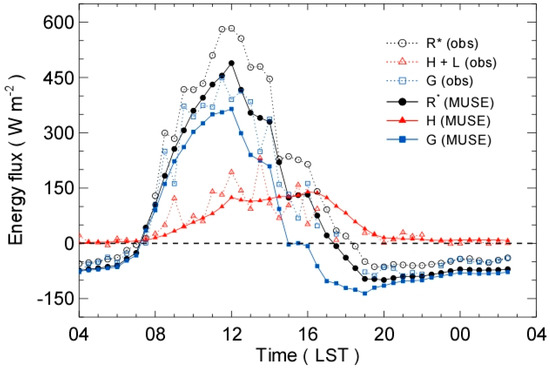The tower measurements are used to provide accurate meteorological forcing for validation of the MUSE model. The global shortwave and longwave radiative fluxes (, , and ) from a four-component radiometer (CNR4, Campbell Scientific Inc., Cache Valley, UT, USA) deployed at the meteorological tower are applied homogeneously to the active patches, in which the measured global shortwave radiative flux is partitioned to the direct and the diffuse radiative fluxes following the empirical method [43,71]. The wind speed () and air temperature () adjacent to the active patches are obtained with interpolation from the wind speed and air temperature profiles computed using the flux measurements from the three-dimensional sonic anemometer (CSAT3, Campbell Scientific Inc., USA) and the Monin–Obukhov similarity relations as follows: