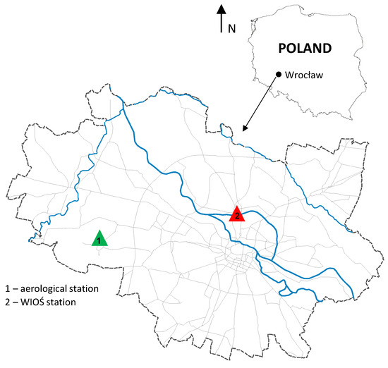 Location of the measuring stations in Wrocław (Poland).