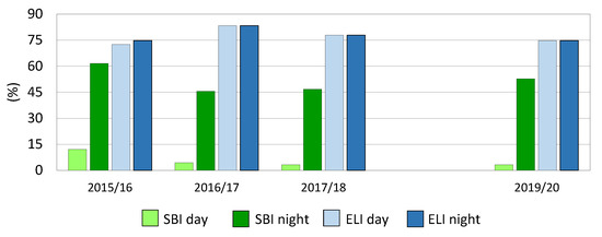 Typically, ELIs do not undergo such transformations in a 24 h period as SBIs do, particularly in stationary weather conditions. Therefore, as is presented in Figure 2, ELI occur with comparable frequencies in both times of the 24 h period. Moreover, the differences in the frequency of occurrence of ELI between the analysed winter seasons were found to be lower than in the case of SBI. In the seasons 2015/16, 2017/18 and 2019/20, they were recorded for approx. 75% of the days, as well as nights. They were recorded slightly more frequently (more than 80%) in the winter of 2016/17.