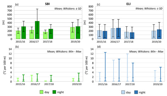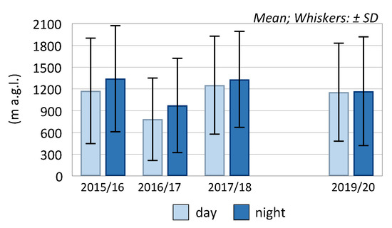 Thickness of SBI layers is a particularly important feature with respect to cities where low emissions are predominant. The increase in the thickness, as well as in the inversion temperature gradient, hinders the movement and air exchange which directly results in an increase in the concentration of pollutants. In three winter seasons, from December 2015 to February 2018, significantly greater thickness was recorded in the case of SBI occurring at night-time, with particularly great thickness (approx. 430 m) recorded in the winter of 2016/17 (Figure 3). The thickness of daytime SBI in these seasons did not exceed 200 m. The last winter season proved to be atypical, as the SBI showed comparable thickness during night-time and daytime.