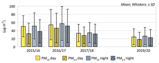 In all analysed winters, the found air pollution with particulate matter was mainly determined by the fraction with an aerodynamic diameter of 2.5 µm, considered by the WHO to be the most harmful to health. As transpires from the analysis of data presented in Figure 5, in the winter seasons of 2016/17, 2017/18 and 2019/20, PM2.5 concentrations were only 3 to 8 μg·m−3 lower than that of PM10. A markedly lower share of particulate matter fraction of <2.5 µm in the particulate matter pollution was found in the first of the analysed winter seasons—daytime and night-time PM2.5 concentrations were lower than that of PM10 by 18 and 13 μg·m−3, respectively.