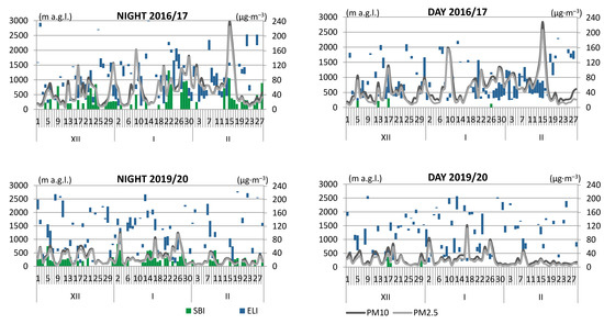 The relationship between PM concentration with the occurrence of TI, proved in numerous studies [11,13,14,15,16,35,36,37], is indicated by the assessment of the variability of PM10 and PM2.5 concentrations against the thickness of both types of inversion layers in each of the analysed winter seasons, and also in the contrastive winter seasons with respect to concentrations, i.e., 2016/17 and 2019/20 (Figure 6). In many cases, the rapid increase in the concentrations of both PM fractions were recorded during the day or night, characterised by a greater thickness of SBI and elevated layers of lower location and greater thickness. In both winter seasons, the negative role of SBI occurring in sequences of consecutive nights was pronounced.