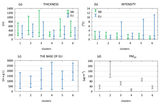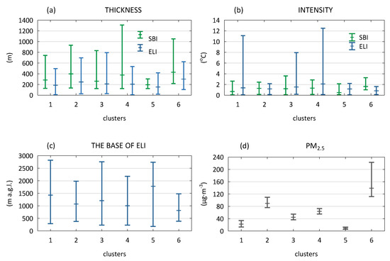 In cluster 1, good air quality was identified at a slightly lower (by approx. 37 m) thickness, yet at twice the intensity of SBI, but most of all at a significantly higher thickness (as much as by 75 m) of ELI occurring at a lower altitude by almost 2.5 times in comparison to cluster 6. The contrastive characteristics between the two clusters were also found with respect to the variability of thickness and the altitude of the base of ELI—very high for cluster 1 and very low for cluster 6 (Figure 7).